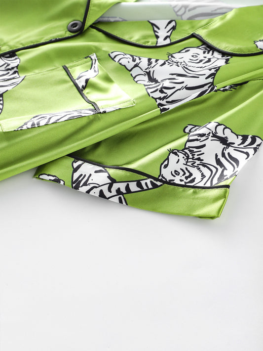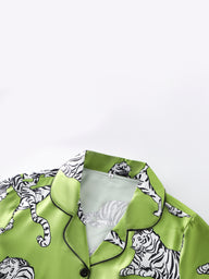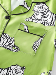 Embrace the power and grace of the wild with this Jungle Majesty Satin Pajama Set. The vibrant olive green backdrop is adorned with striking white tiger prints, symbolizing strength and elegance. Crafted from silky satin, this set offers a smooth, breathable, and ultra-soft feel for ultimate relaxation. The short-sleeved button-up top and elastic waist shorts provide a comfortable yet stylish fit, making it perfect for lounging in luxury or adding a bold touch to your nighttime wardrobe.