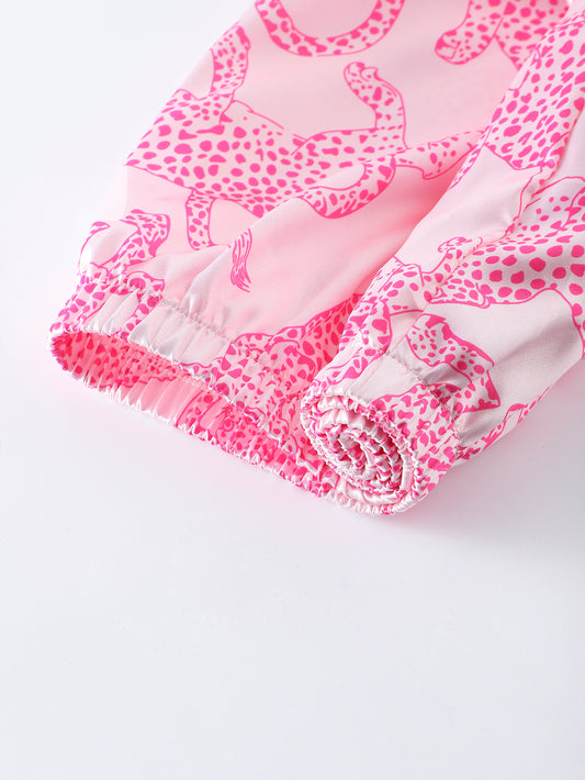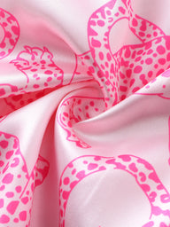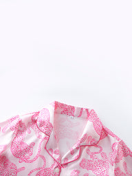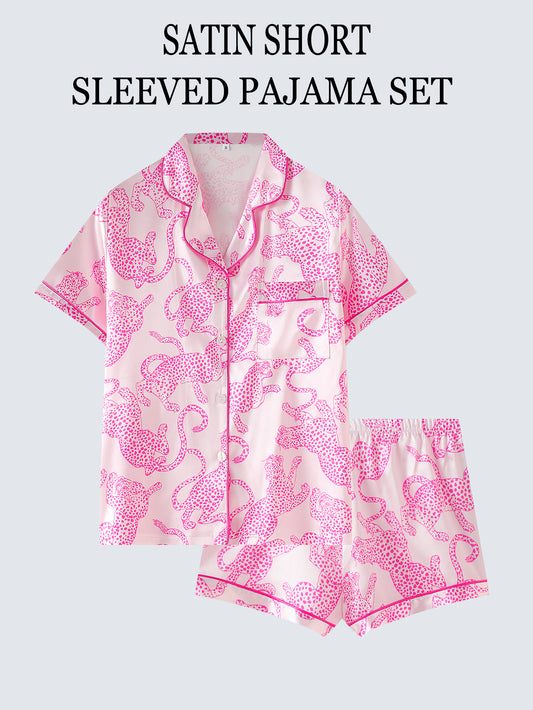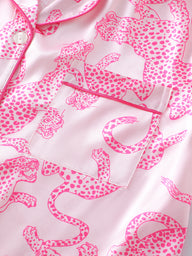 Unleash your inner wild side with this Pink Panther Satin Pajama Set. Designed with a soft blush pink satin fabric, this set is adorned with bold hot pink leopard prints, adding a fun and fierce touch to your loungewear. The luxurious silky texture ensures a smooth and breathable feel, perfect for a restful night's sleep. Featuring a short-sleeved button-up top and elastic waist shorts, this set combines comfort and style effortlessly. Whether you're unwinding at home or making a statement at a sleepover, this pajama set is a must-have for those who love chic and playful fashion.