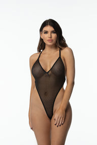 Women's lingerie Sensuelle Mesh Teddy is made from sheer polka-dot flocked mesh in a classical front design. The back sports cross-over adjustable hemmed straps and a sexy high-waist T-string design, with an added hit of provocative femininity in the mini bow details.