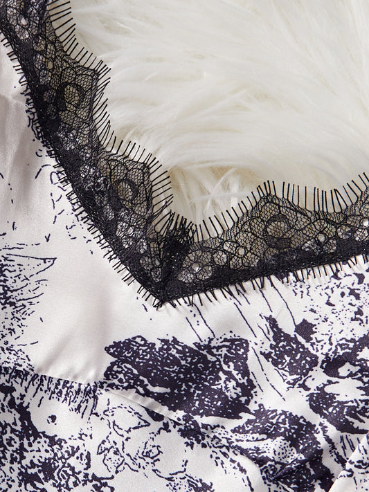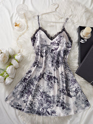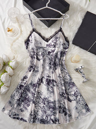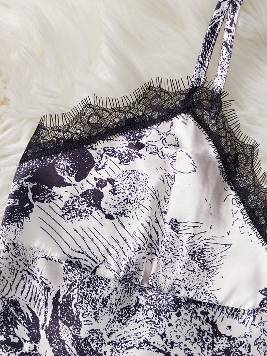 Step into elegance with the Midnight Garden Satin Nightdress. Adorned with a delicate black floral print over a lustrous satin base, this slip dress features slender adjustable straps and a touch of lace trim at the neckline. The soft A-line silhouette glides gently against the skin, offering a perfect blend of romance and sophistication for your evenings.
