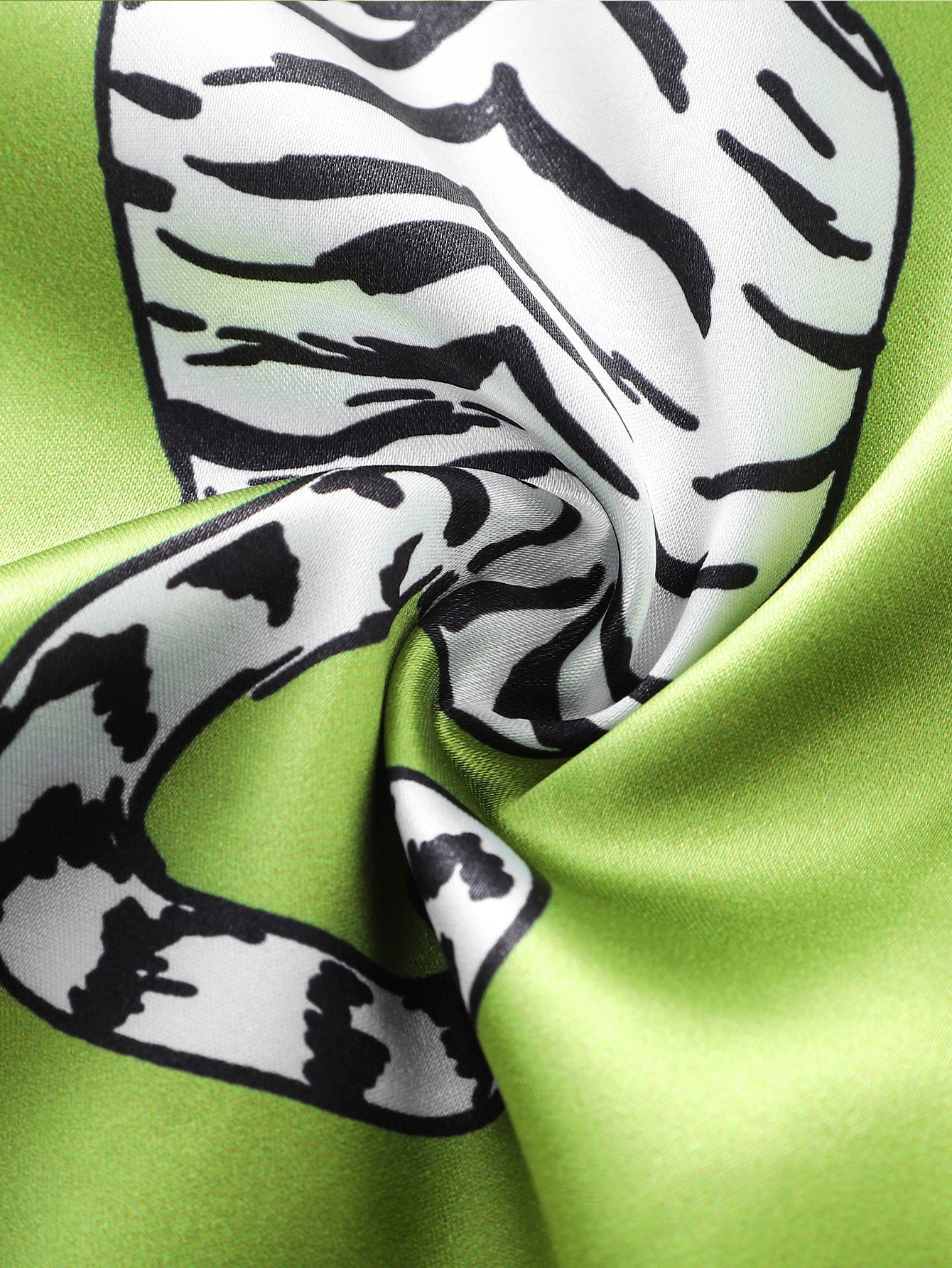 Embrace the power and grace of the wild with this Jungle Majesty Satin Pajama Set. The vibrant olive green backdrop is adorned with striking white tiger prints, symbolizing strength and elegance. Crafted from silky satin, this set offers a smooth, breathable, and ultra-soft feel for ultimate relaxation. The short-sleeved button-up top and elastic waist shorts provide a comfortable yet stylish fit, making it perfect for lounging in luxury or adding a bold touch to your nighttime wardrobe.