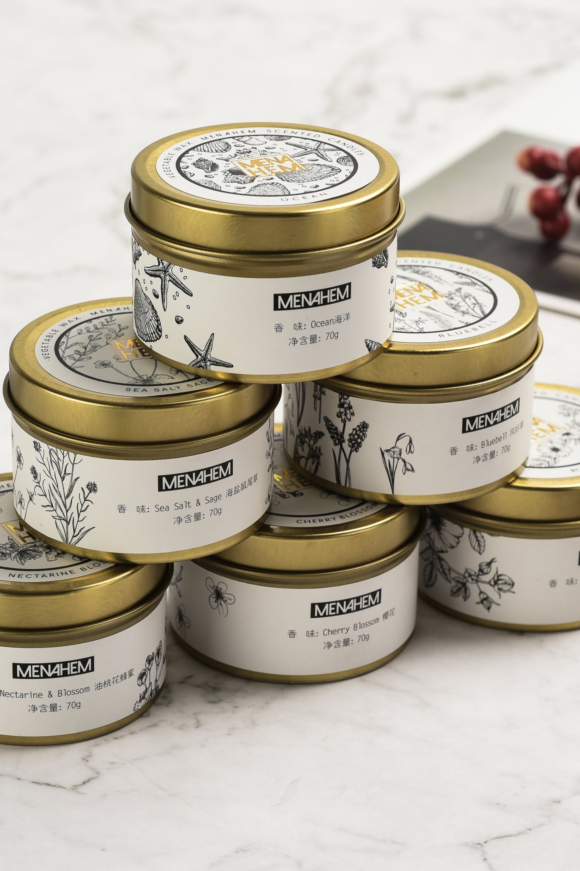 This sleek, chic metal tin candle is made with premium with soy wax. Each tin has straight + smooth sides for a seamless look.