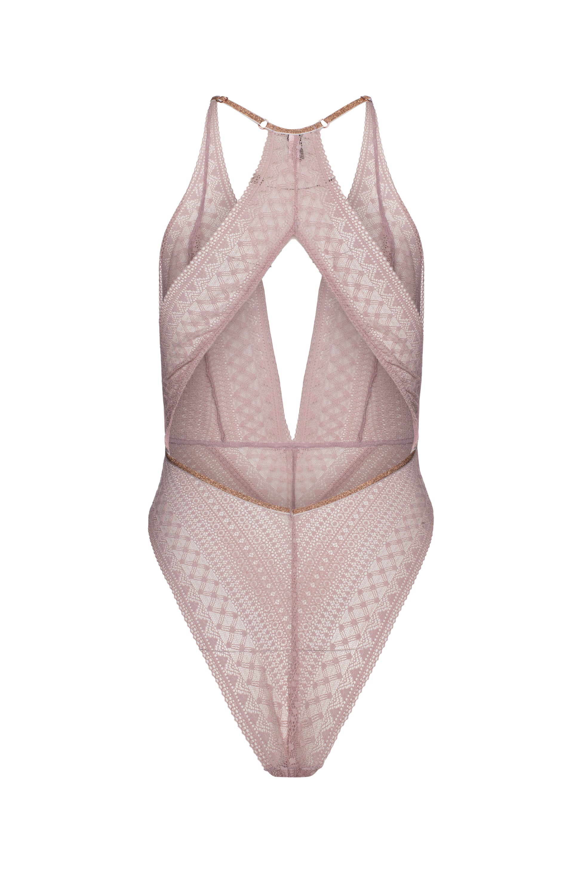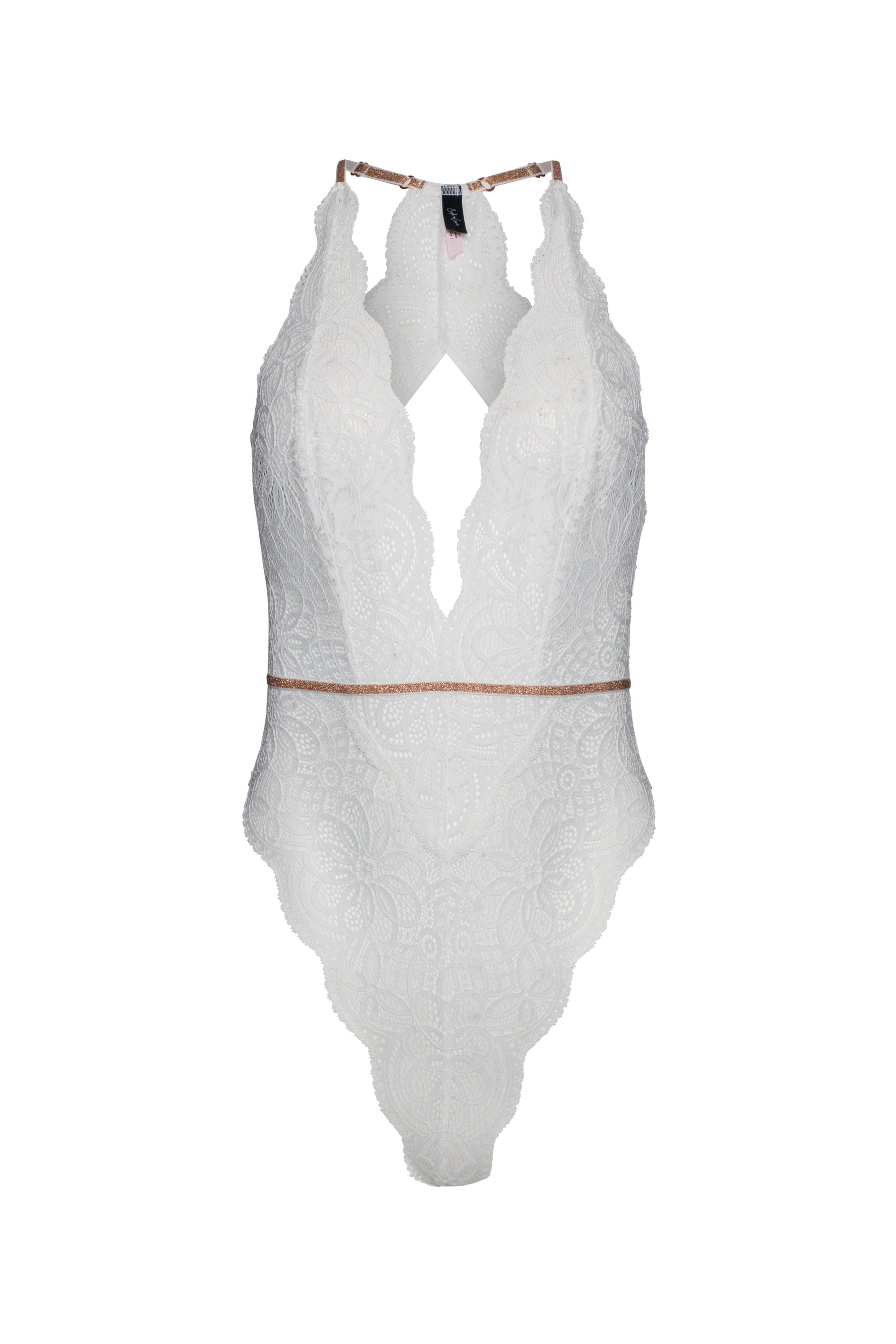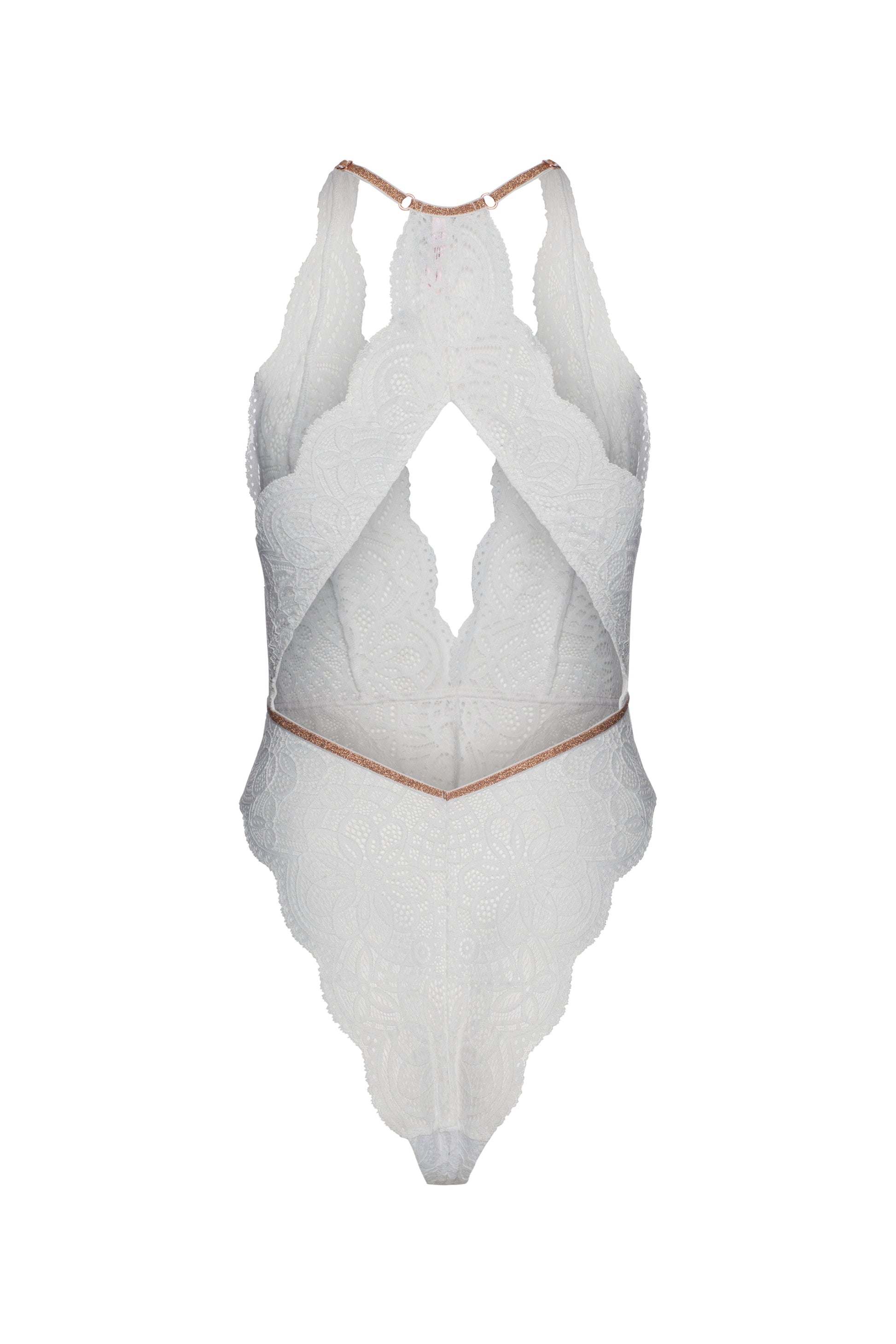 Women's lingerie teddy. White lace with gold metallic sraps design.
